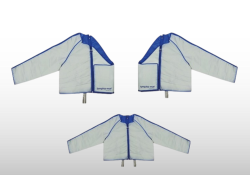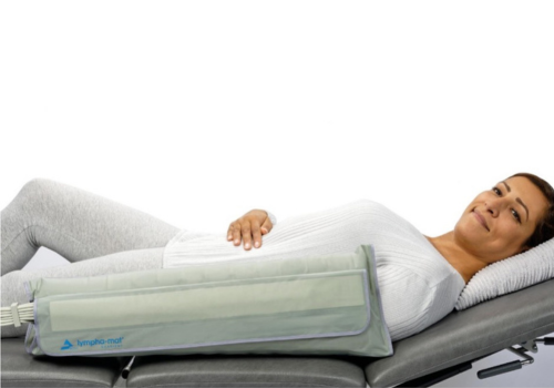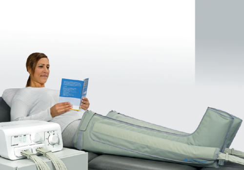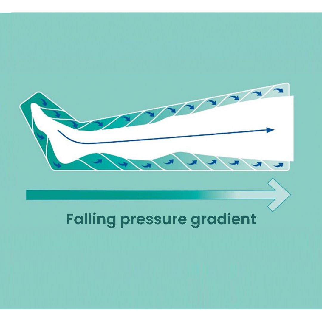 The 12-level gradient system of treatment is effectively achieved through specially developed sleeves containing overlapping air chambers which successively fill with air to provide a theraputic gradient pressure. This gradient intermittent compression mobilizes the fluid in the limb allowing it to disperse unhindered and without return flow. A significantly minimized pressure at the sleeve’s end relieves the adjacent drainage area and is highly positive on lymphatic edema. The tissue is decongested, and metabolism and gas exchange are significantly improved.