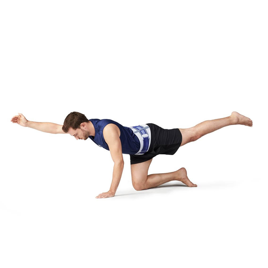 Maintenez brièvement la position puis répétez le mouvement avec l’autre genou et l’autre bras.